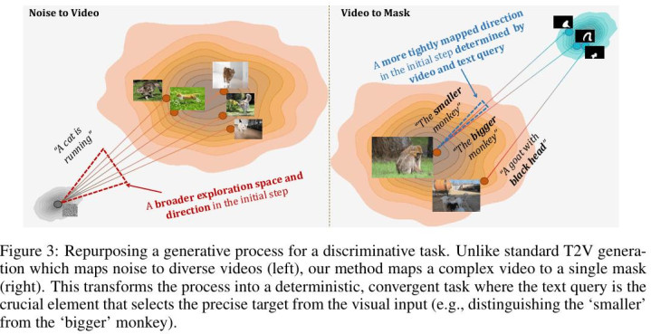 范例的视频生成是一个随文本辅导的 “探索” 经过 —— 从一个噪声开拔,极端是不细则的,模子需要在多步迭代中渐渐 “画” 出细节,每一步都充满了飞速性与创造性。但 RVOS 迥乎不同,它是一个极致的管理经过。无论输入视频何等复杂,关于给定的文本辅导,方针的 Mask 是唯独、固定且细则的(Deterministic)。