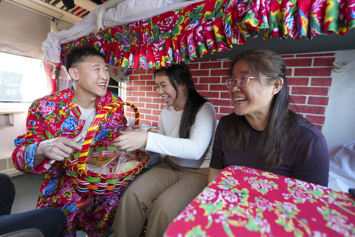 2月4日,在K7103次“列车大集”卧铺车厢内,身穿民俗服饰的乘务人员为旅客赠送煎饼。新华社记者王松摄