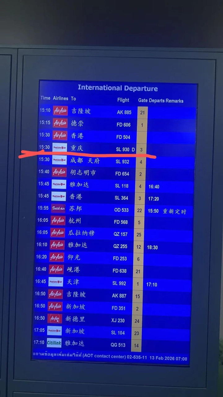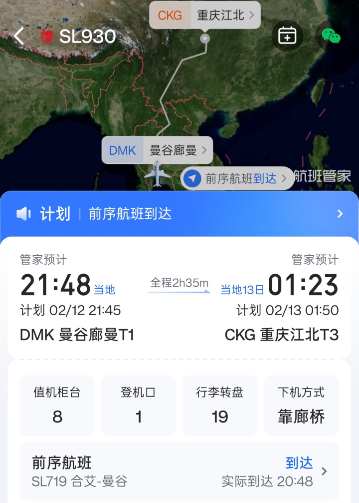 随后,记者查询航班管家APP发现,2月12日的SL930次航班原研究21点45分(当地时辰)升空,次日1点50分(当地时辰)到达重庆江北机场,捏飞航司为泰国狮航。