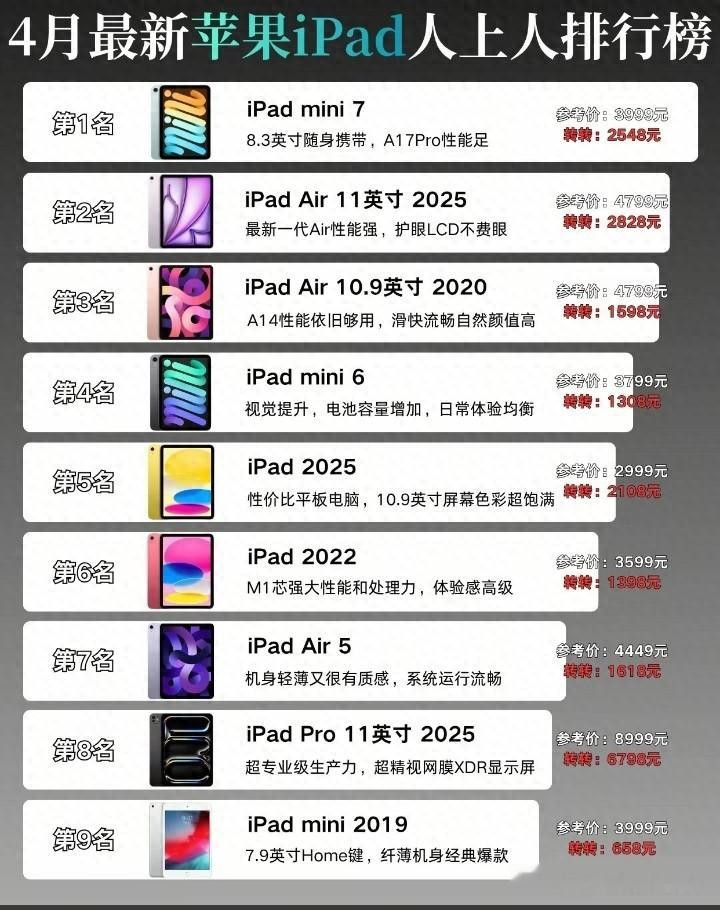 2026年4月,苹果iPad系列居品凭借各类化的尺寸、性能与功能定位,不绝引颈平板电脑市集。从迷你便携的iPad mini 7到专科级的iPad Pro 11英寸2025款,九款热点机型掩饰了文娱、学习、办公与创作等全场景需求,为用户提供了丰富的遴荐。