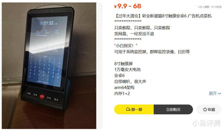 昆仲们,二手鱼里又冒出来一个让垃圾佬们心痒痒的小玩意儿。最近有一批全新的彩蛋猫8寸点餐机流出来了,卖家说只卖教程,但也提供了整机,教程9.9块,整机径直干到了68块。许多老铁第一响应详情是:给我看这个垃圾干啥?划走!